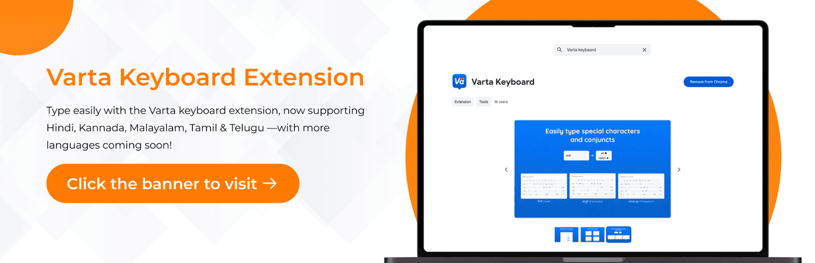 Varta Keyboard enables typing in multiple Indian languages directly from your browser using a standard QWERTY keyboard.